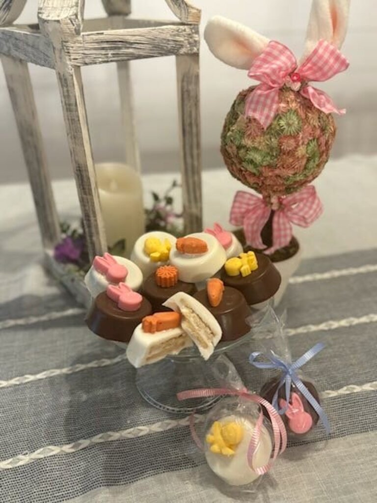 Chocolate dipped oreo with a chocolate Easter themed embellishment. Made in a home kitchen. NOT a nut free kitchen. Pick up will be during store hours on Saturday 4/19/25 or you may message to set up a specific date. A 48-hour notice is required.